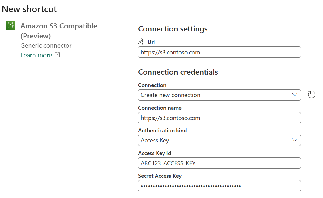 Field Description Value URL The connection string for your S3 compatible endpoint. For this shortcut type, you must provide a non-bucket specific URL. This URL must allow path style bucket addressing, not just virtual hosted style. https://s3.contoso.comConnection Previously defined connections for the specified storage location appear in the drop-down. If no connections exist, create a new connection. Create new connection Connection name The S3 compatible connection name. A name for your connection. Access Key ID The access key ID to be used when accessing the S3 compatible endpoint. Your access key. Secret Access Key The secret key associated with the access key ID. Your secret key. Select Next.