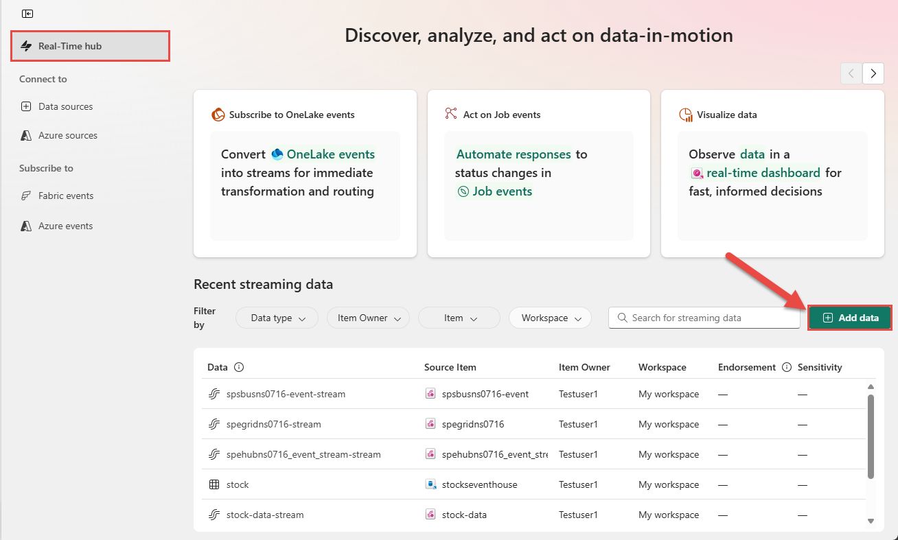 You can also get to the Data sources page from the Real-Time hub page by selecting the + Add data button in the top-right corner.