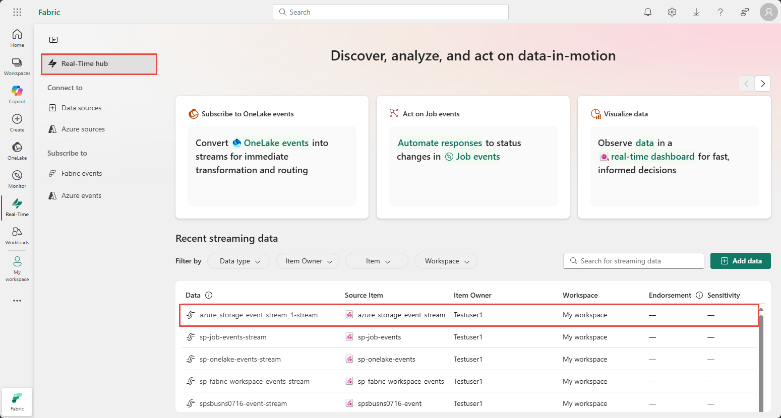 Select Real-Time hub on the left navigation menu, and confirm that you see the stream you created. Refresh the page if you don't see it.