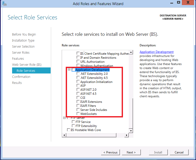 Note that a number of default sub-features for IIS have already been turned on because you selected the Web Server (IIS) server role earlier. However we want to enable both ASP.NET 3.5 and ASP.NET 4.5 to run on IIS 8.0, so we need to enable some additional IIS related features. Scroll down in the Role services list until the Application Development node is showing. This node is collapsed initially, click on the node and expand it so that its children are showing: