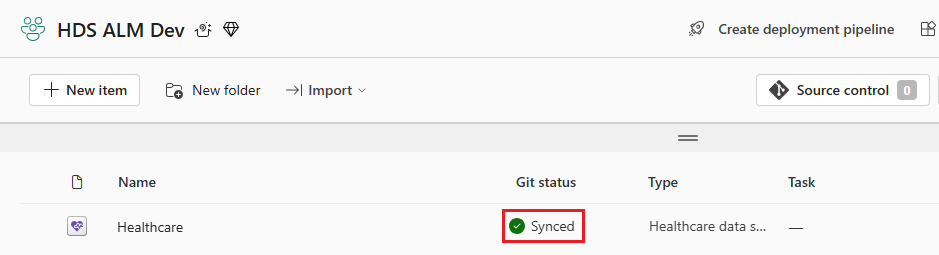 After the sync completes, verify that the Git status value for your healthcare solution item displays Synced.