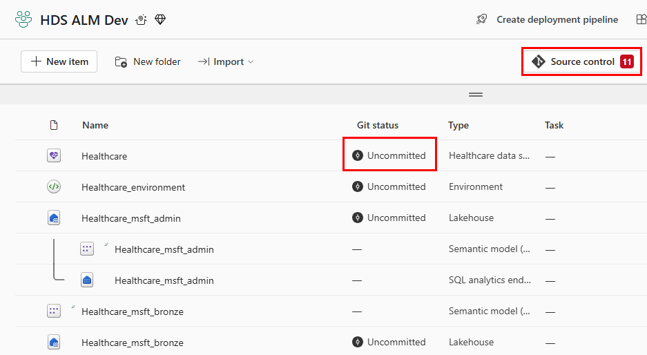 After the deployment, on the main workspace view, you should see the new items deployed with an updated Git status value. Because of these new updates, your healthcare solution git status value now changes to Uncommitted.