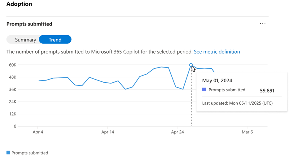 Trend view shows the daily trend of prompts submitted in Microsoft 365 Copilot over the selected time frame.
