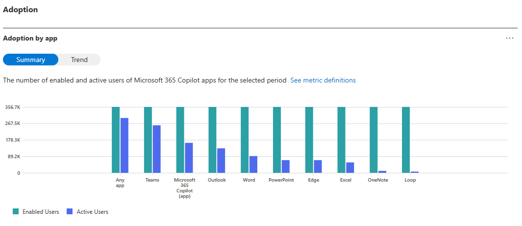 You can view several numbers for Microsoft 365 Copilot usage, which highlight the enablement number and the adoption of the enablement: