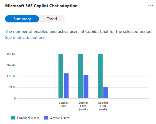 The data in these reports is based on the same underlying definitions of active usage, but the population of users included in the analysis and the timeframe displayed might differ. To learn more, see Use Microsoft Copilot Dashboard advanced features with a Viva Insights subscription.