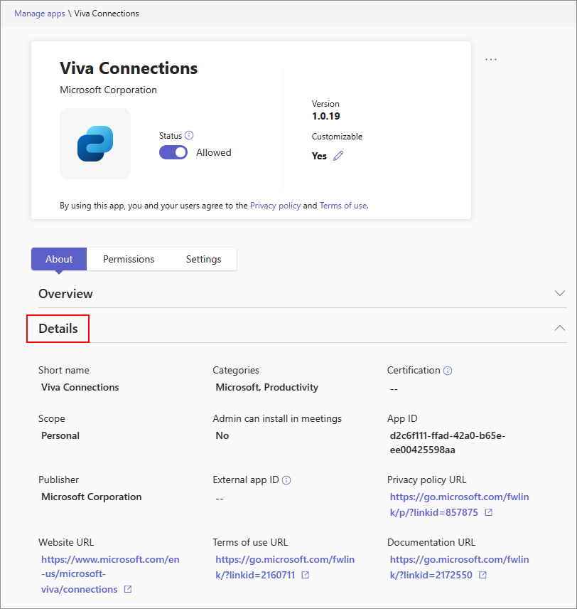 • App details page of the app in Manage apps page in Teams admin center.