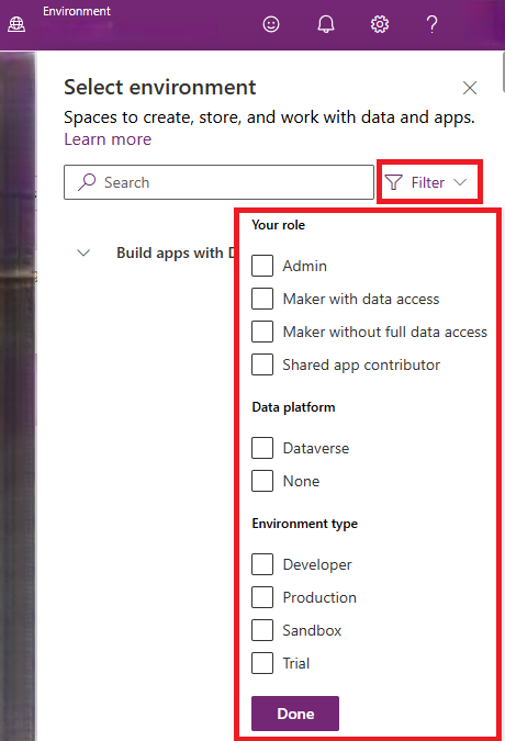 With the environment selector, environments are grouped into two types: Build apps with Dataverse and Other environments. Select Filter to filter the list of environments by your role, data platform (Dataverse or none), and environment type, like production or sandbox.