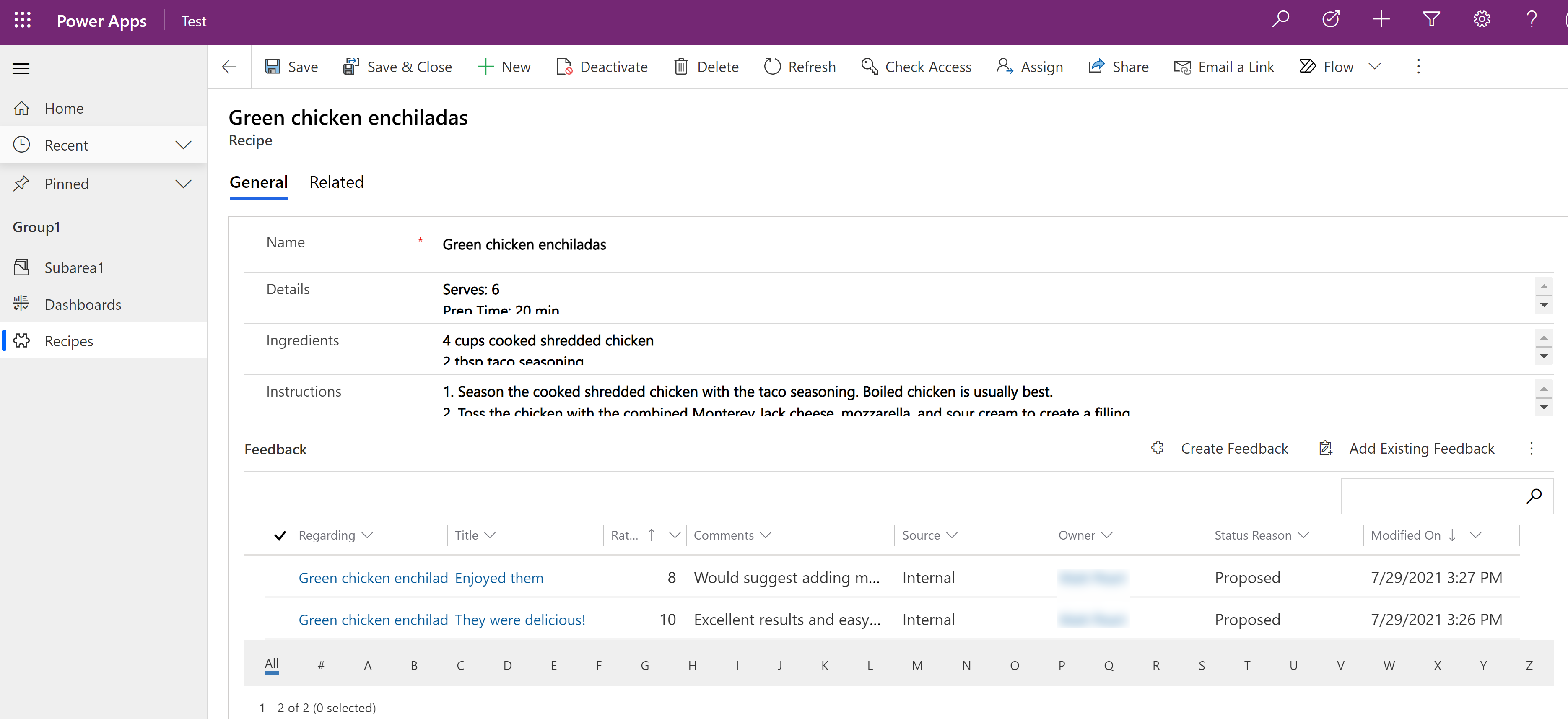 - Source. Recipe (or the table that has the feedback subgrid)