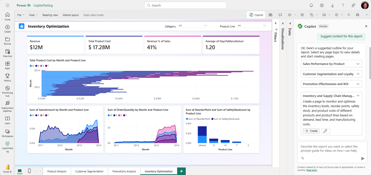 Each sample prompt is paired with a report page that Copilot generated based on the interpretation of that prompt. Your prompts help Copilot understand what you're looking for, but they might not produce a page that's exactly what you want. It's a starting point for report page creation. Use the user interface to modify the report page that Copilot created.