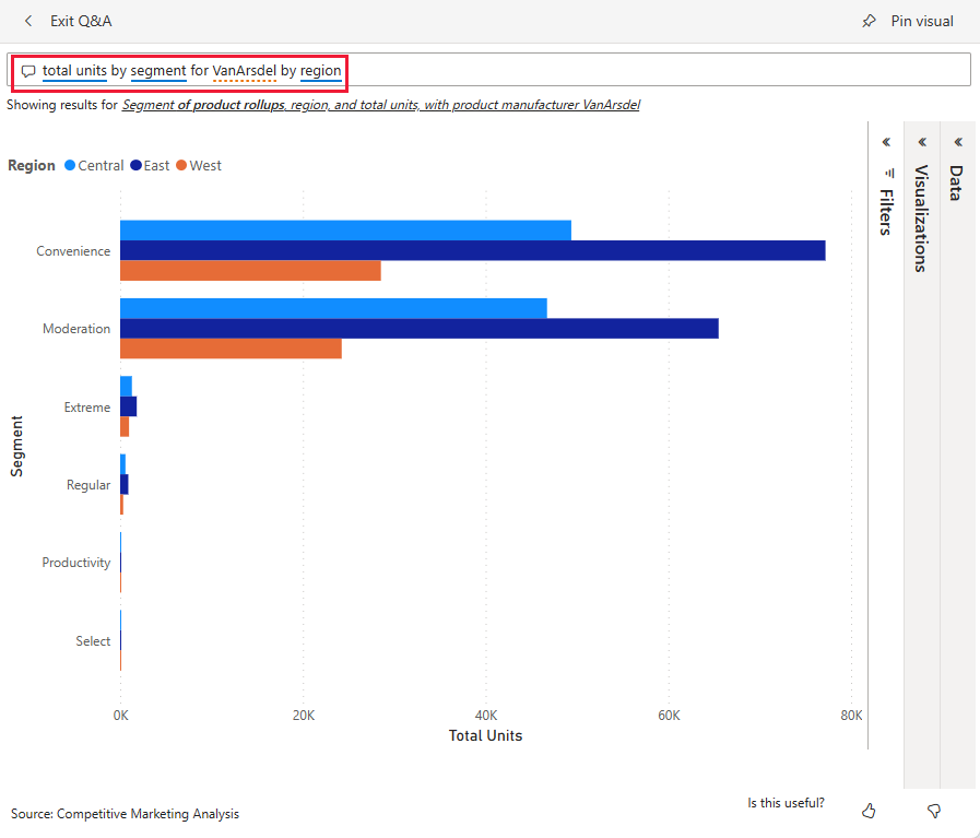 In Ask a question about your data, enter total units by segment. The dashboard displays the data as a visualization.