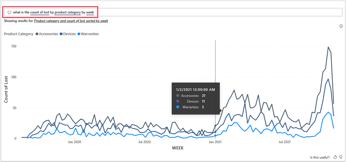 A natural language query, or Q&A visualization, offers the ability to ask questions about data in natural language to explore your data. The report can respond to your queries and make suggestions for useful queries.