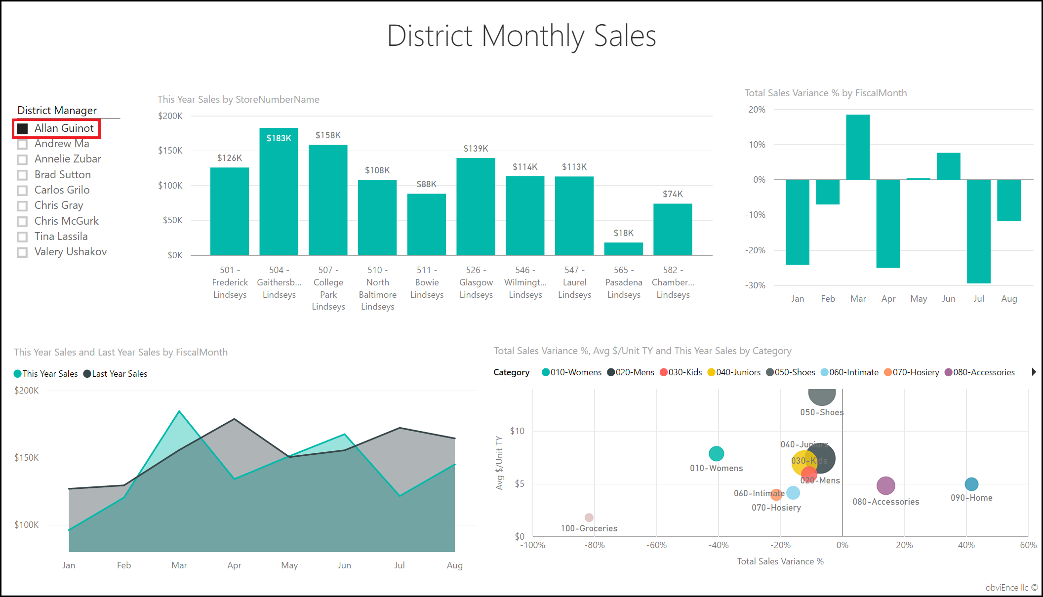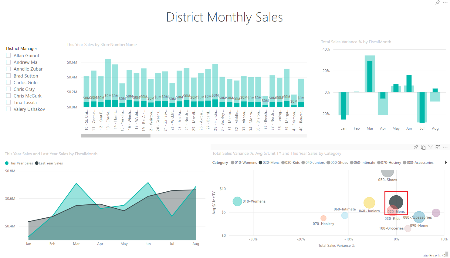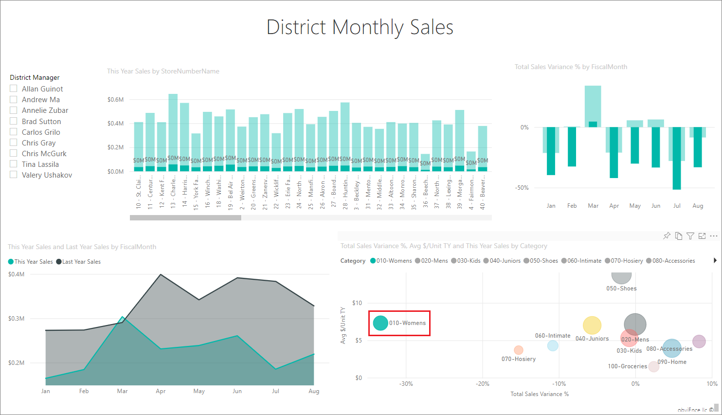 On the dashboard, select the This Year's Sales, Last Year's Sales tile, which opens the District Monthly Sales page of the report.