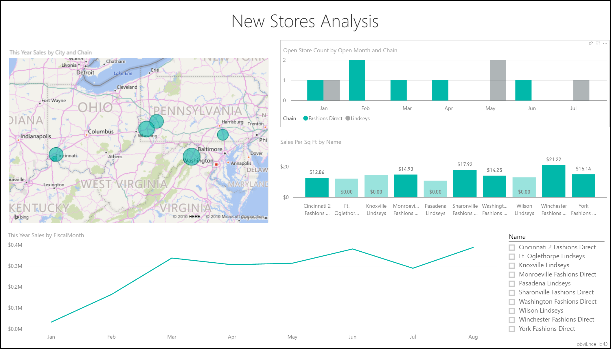 Select Cincinnati 2 Fashions Direct in the slicer and observe in the line chart that it opened in June and appears to be the worst performing store.