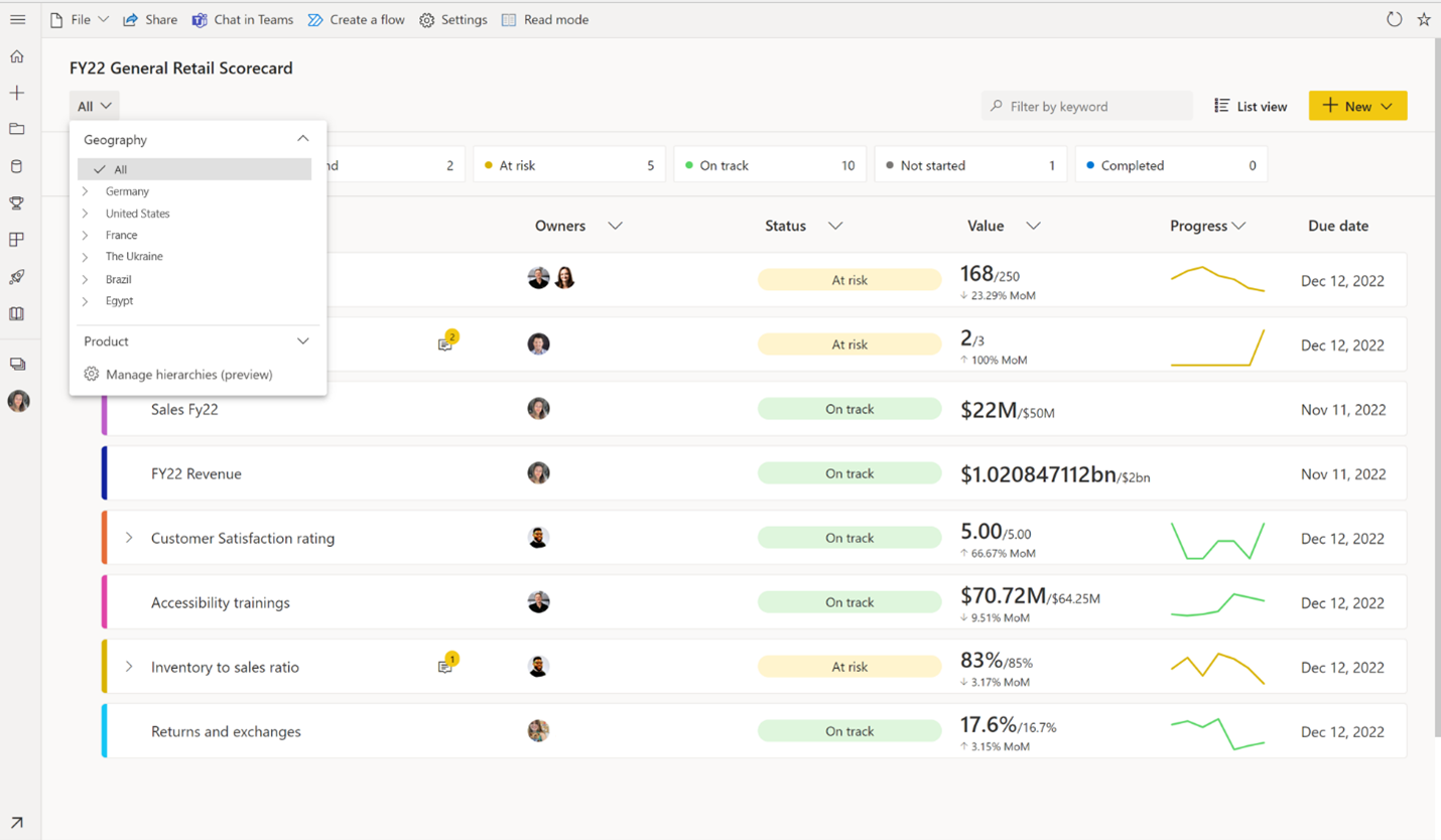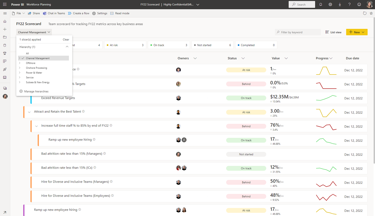 All connected values, mapped owners, and statuses dictated by rules reflect the appropriate data at each hierarchy level, so long as the relationships exist. There needs to be a relationship between the hierarchy level fields in the underlying semantic models to correctly filter the values. Manual goals are shown through an information icon showing which values are manual for that metric.