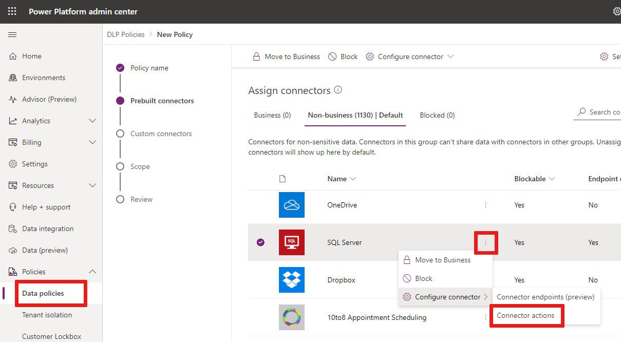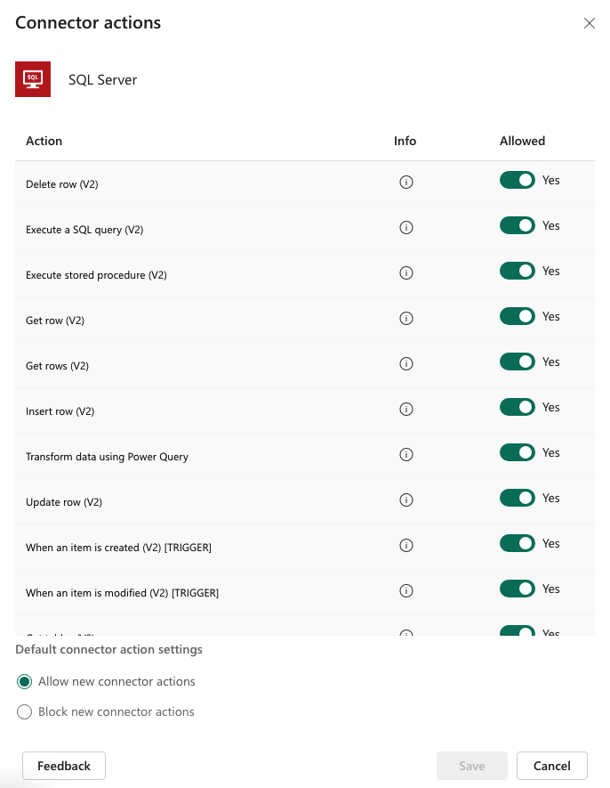 You can also set the Default connector action settings to allow or block for any new connector actions that will be added to the connector in the future.