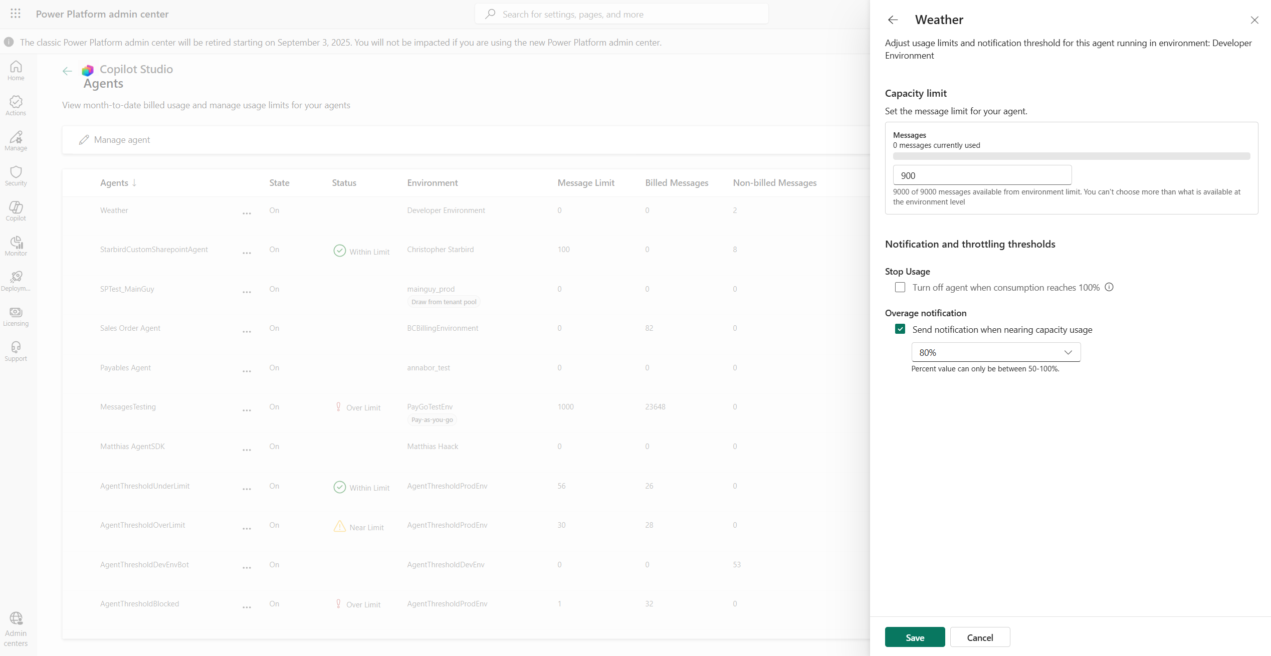 • Notifications: Admins, both at the environment and tenant level, receive alerts when an agent’s usage approaches the defined limit.