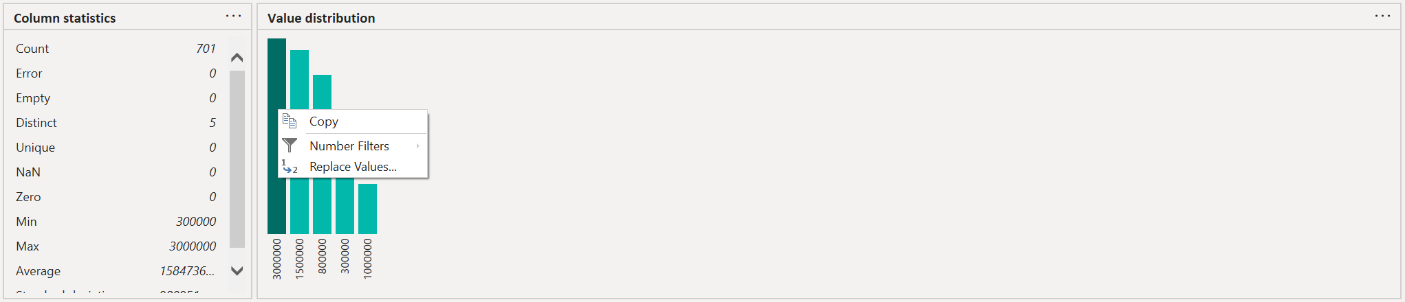 In the upper-right corner of both the column statistics and value distribution sections, you can select the ellipsis button (...) to display a Copy shortcut menu. Select it to copy the data displayed in either section to the clipboard.