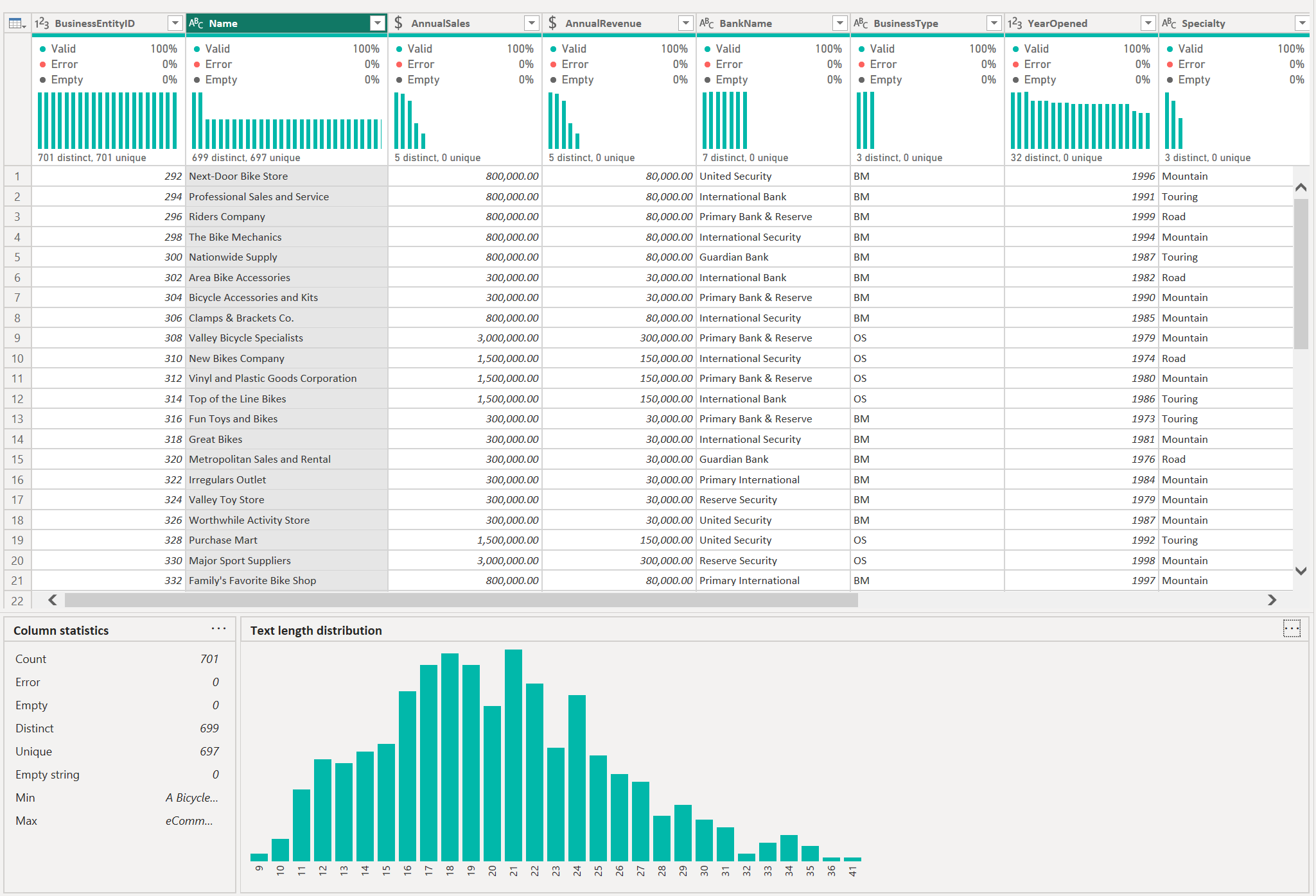 By default, Power Query performs this data profiling over the first 1,000 rows of your data. To have it operate over the entire data set, select the Column profiling based on top 1000 rows message in the lower-left corner of your editor window to change column profiling to Column profiling based on entire data set.