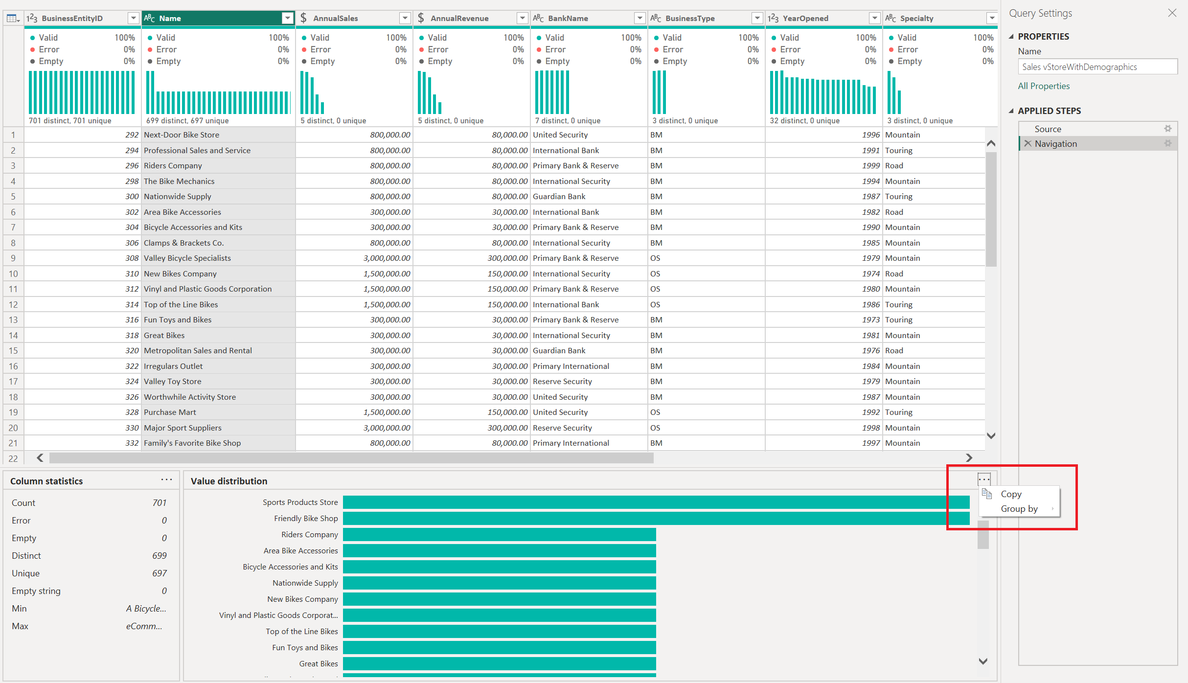 After you enable the options, the data profiling information displays in the Power Query editor.