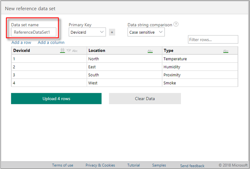 A Reference Data Set is a collection of items that augment the events from your event source. Azure Time Series Insights ingress engine joins each event from your event source with the corresponding data row in your reference data set. This augmented event is then available for query. This join is based on the Primary Key column(s) defined in your reference data set.