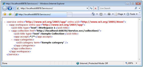 The following code example illustrates how to use the AtomPubClient class to navigate an AtomPub service and add a new Atom entry into the first workspace collection: