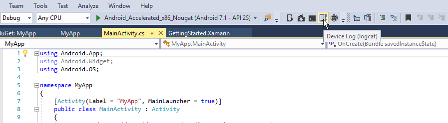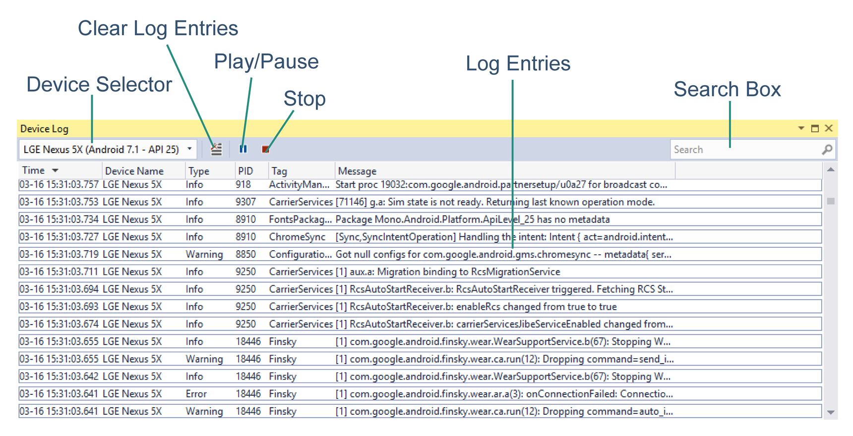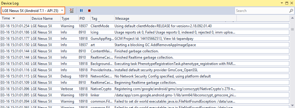 After the device is selected, the Device Log tool automatically adds log entries from a running app – these log entries are shown in the table of log entries. Switching between devices stops and starts device logging. Note that an Android project must be loaded before any devices will appear in the device selector. If the device does not appear in the device selector, verify that it is available in the Visual Studio device drop-down menu next to the Start button.