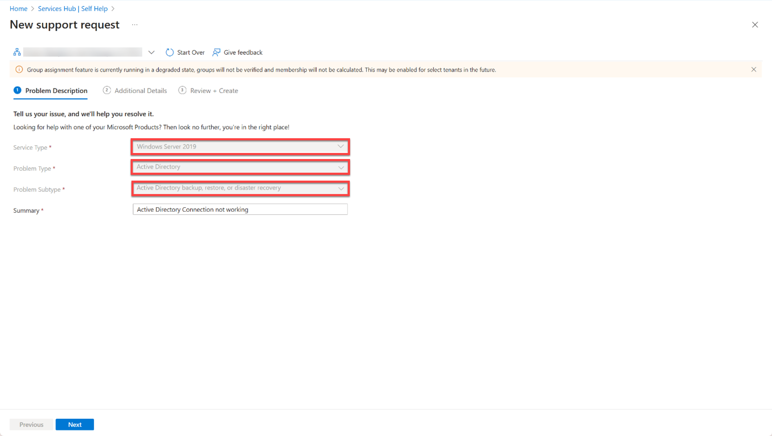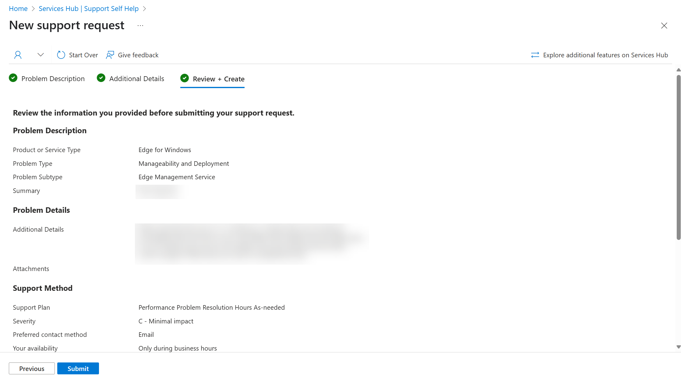 In the Additional Details section, fill in all the required boxes to provide additional details related to your problem support request.
