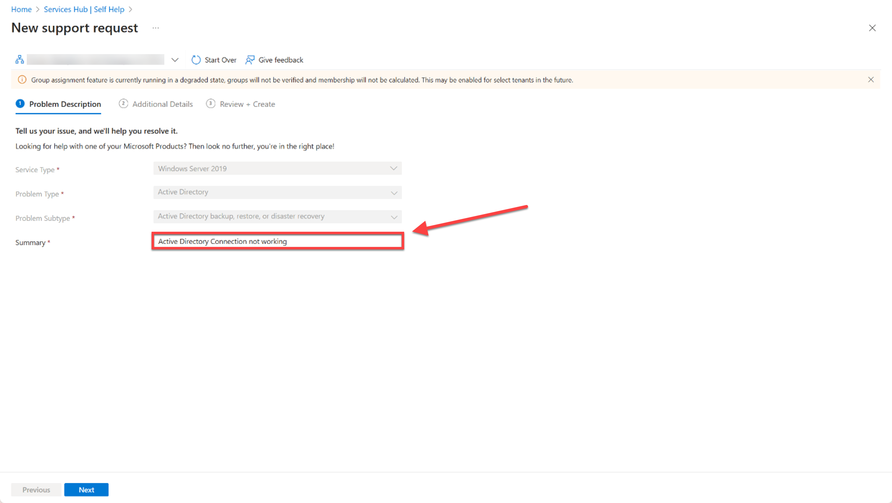In the Problem Description section, select your Service type, Problem type, and Problem subtype from the dropdown lists. Then provide a summary of your current problem.
