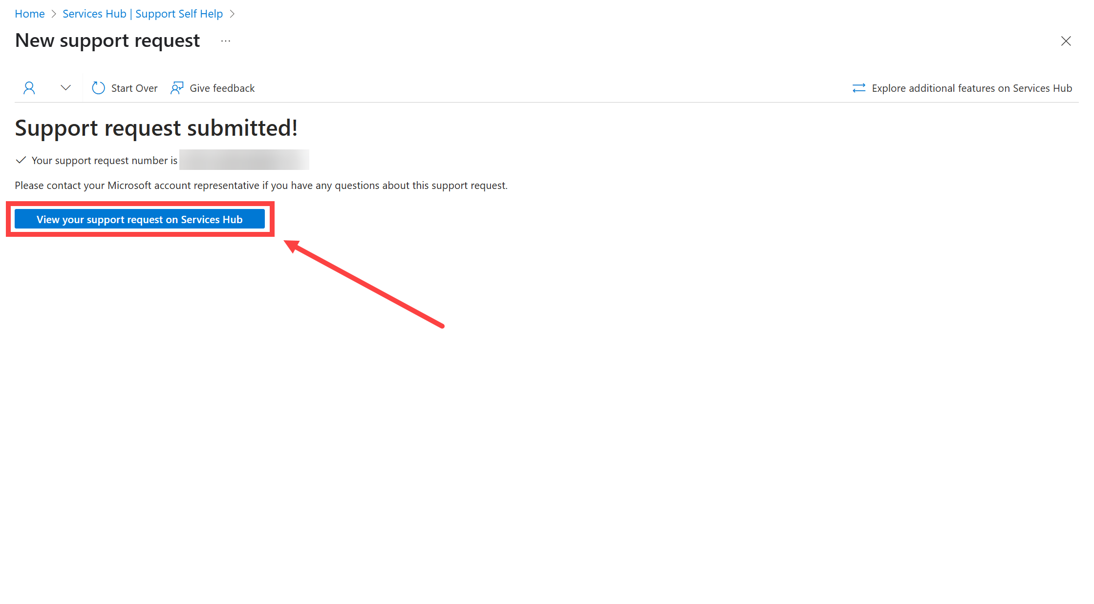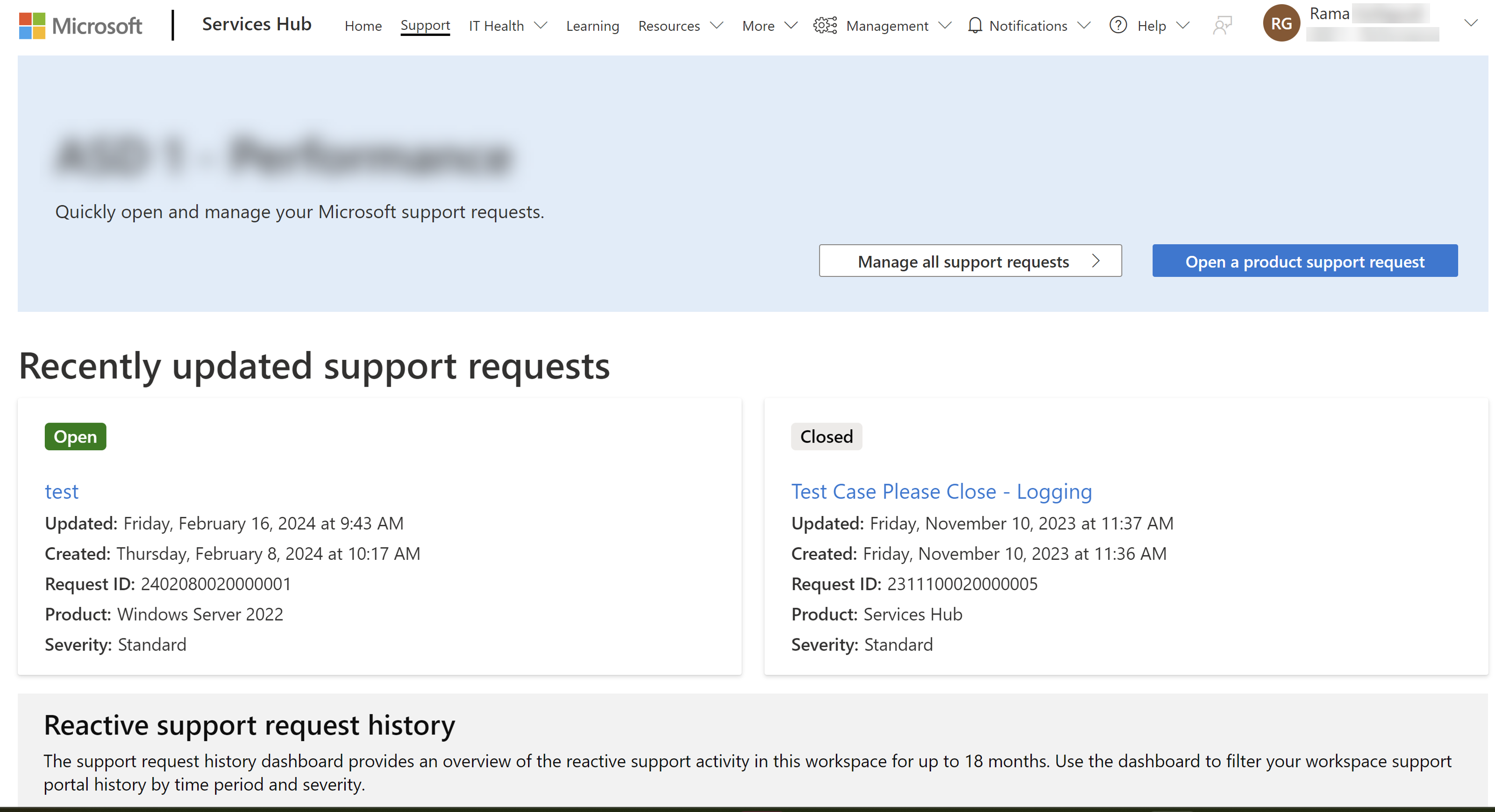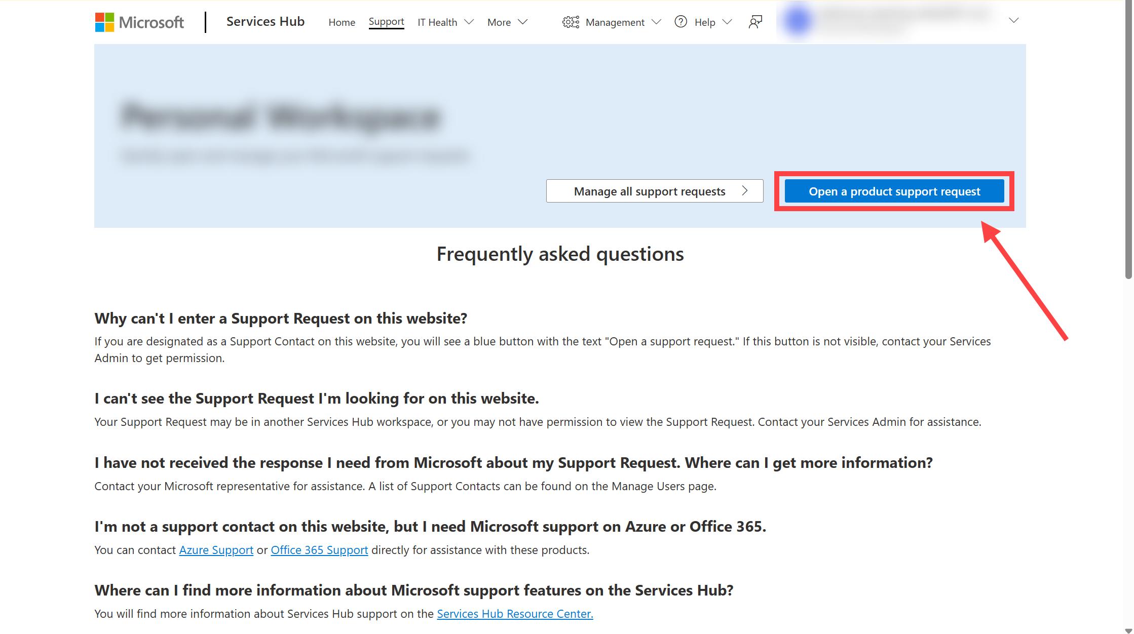 Sign in to Services Hub, and select Support from the ribbon along the top of the page.