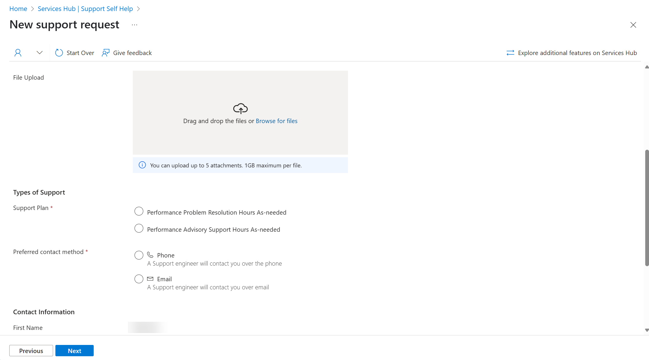 Select Use the new support experience in Services Hub, then continue to the step three in this article to determine which set of instructions you should follow.