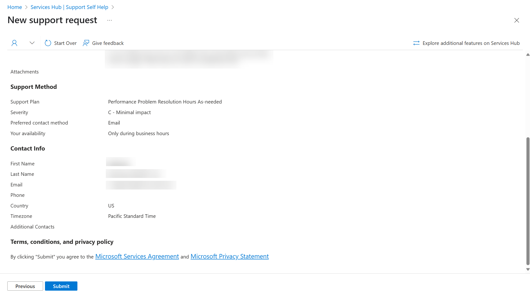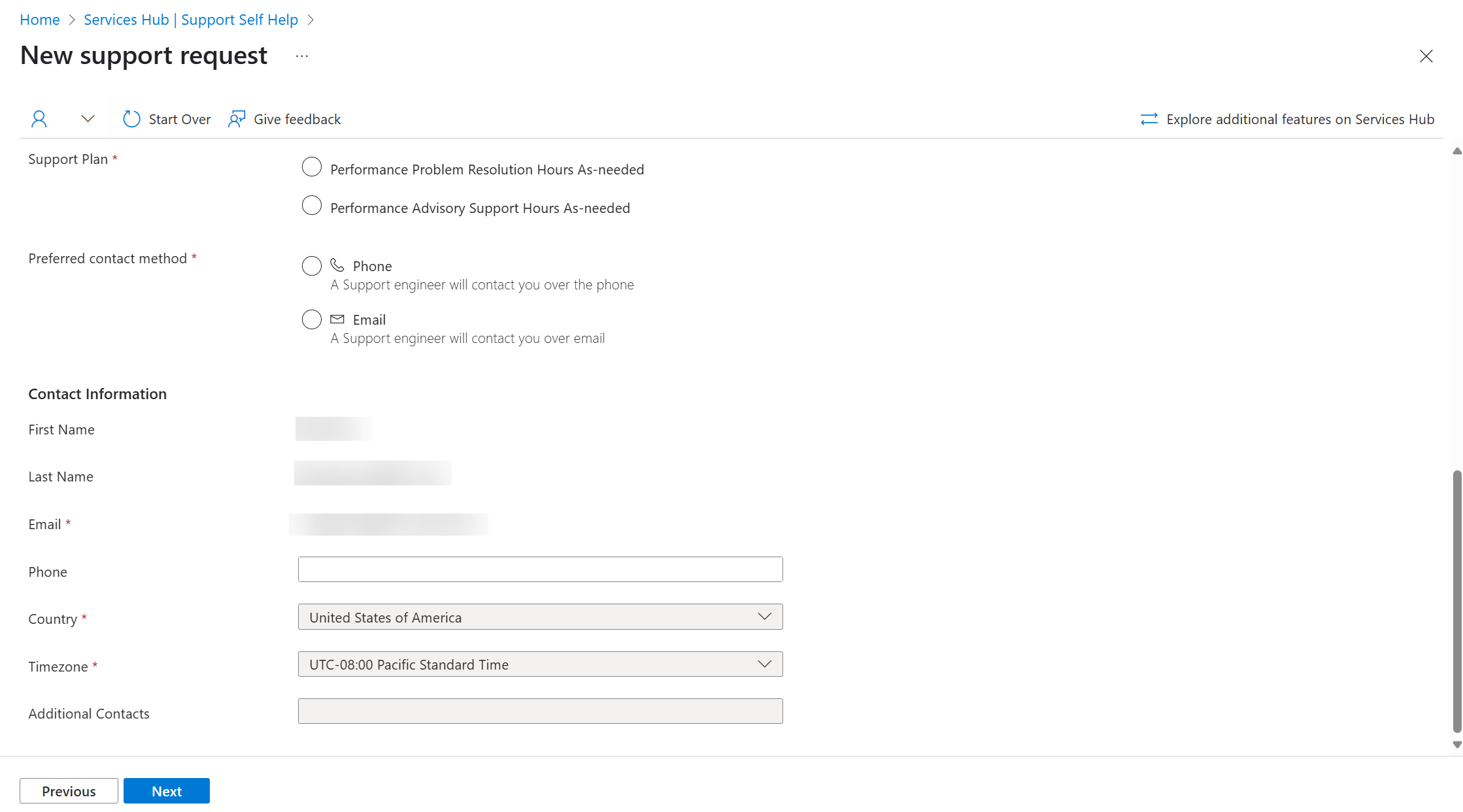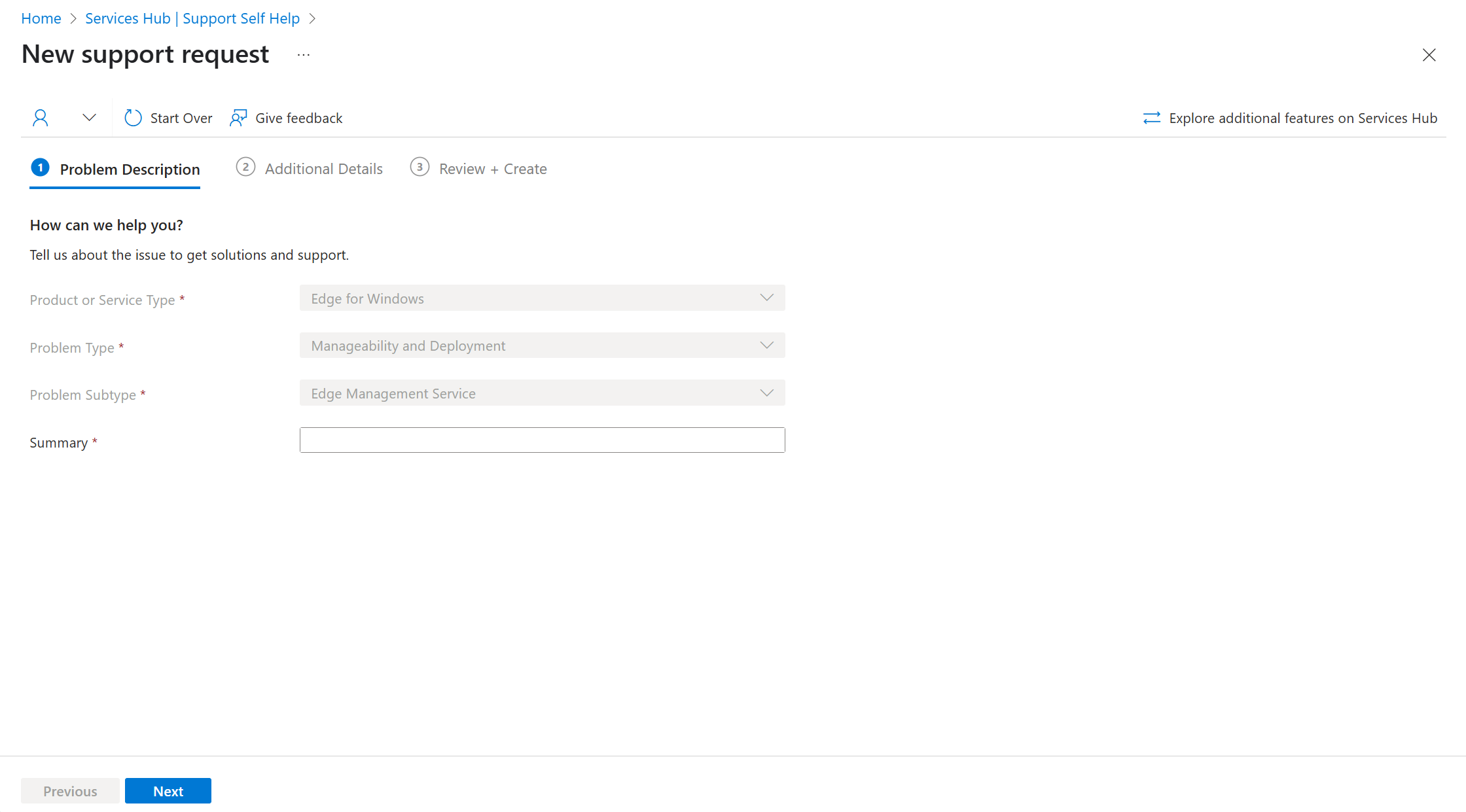 If you see this support request creation form after you select Use the new support experience in Services Hub, select Enhanced experience from the tabs at the top of this article, then follow the provided instructions.