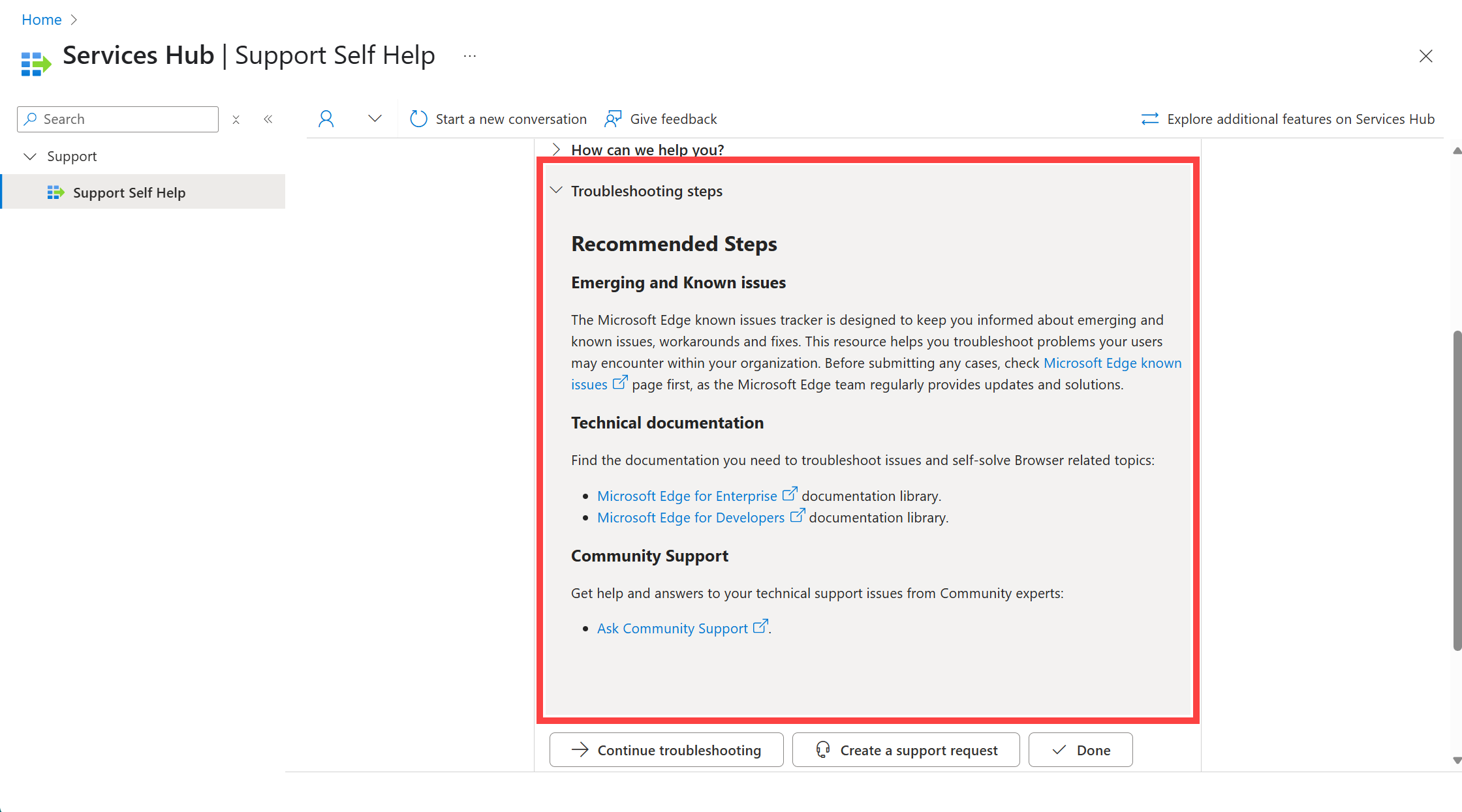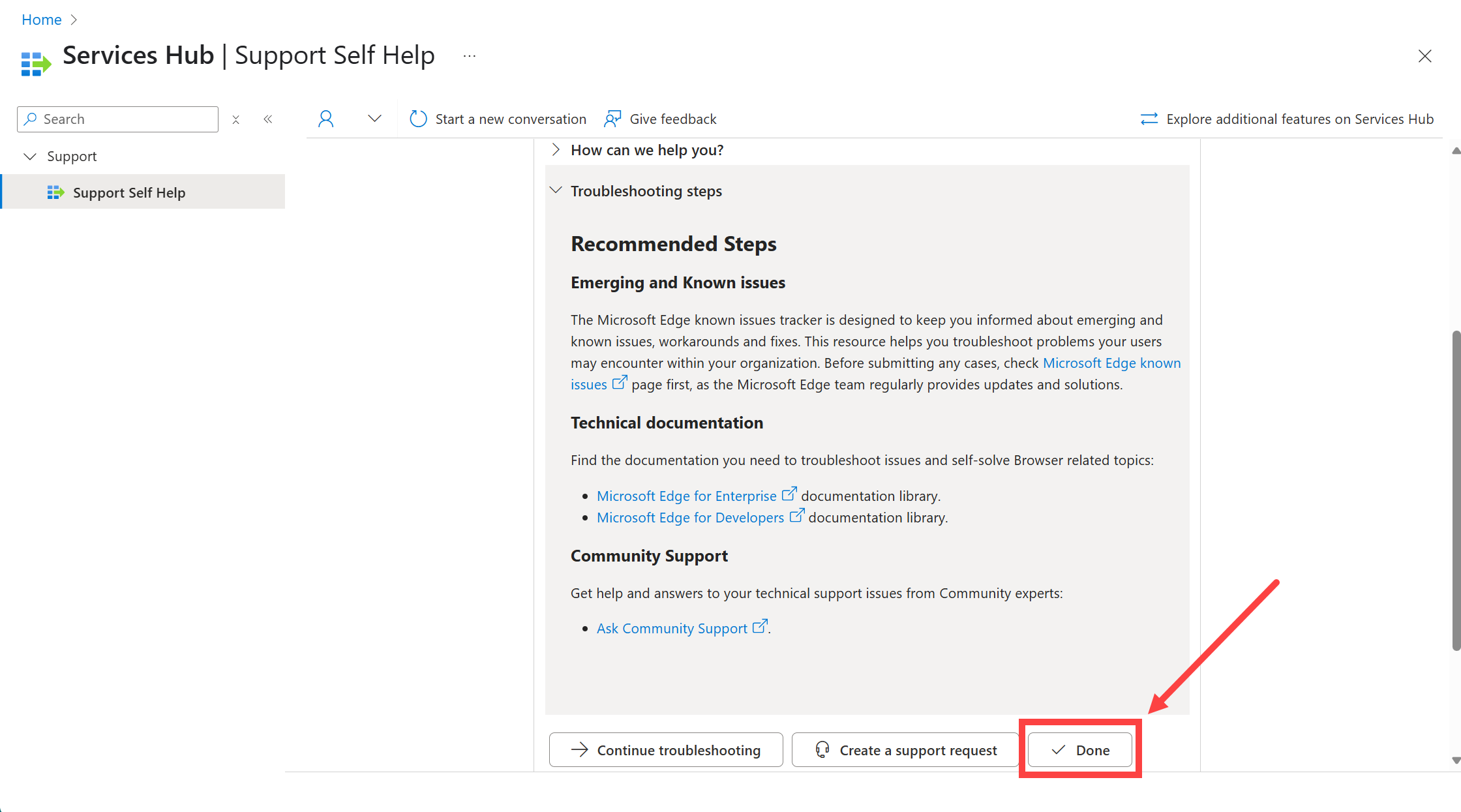 Select "Done" if the latest information solved your issue. Select "Create a support request" if you still need more assistance (go to step five for instructions).