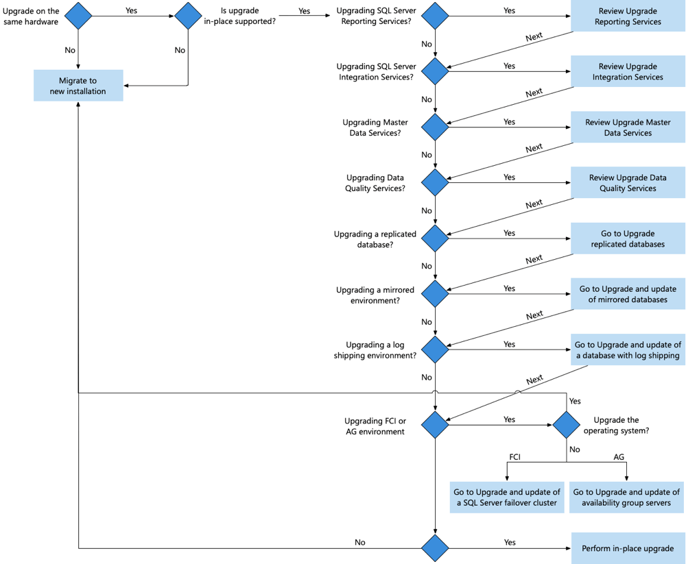 There are several approaches to consider when you're planning to upgrade the Database Engine from a prior release of SQL Server, in order to minimize downtime and risk. You can perform an upgrade in-place, migrate to a new installation, or perform a rolling upgrade. The following diagram helps you to choose among these approaches. Each approach in the diagram is also discussed in the article. To assist you with the decision points in the diagram, also review Plan and test the Database Engine upgrade plan.