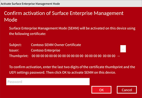 Enter the last two characters of your certificate thumbprint and your UEFI settings password, then select OK to proceed.