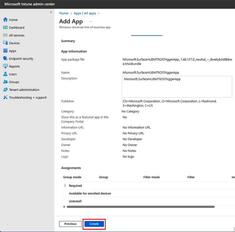 Under the Assignments tab, specify how the app is deployed to your Surface Hub 2S devices. You can make the app available for enrolled devices or assign it as required.