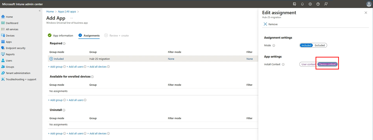 Under Required Group mode > Install Context, select User context link, and in the flyout pane, change the App settings toggle to ensure Device context is selected and then select OK.