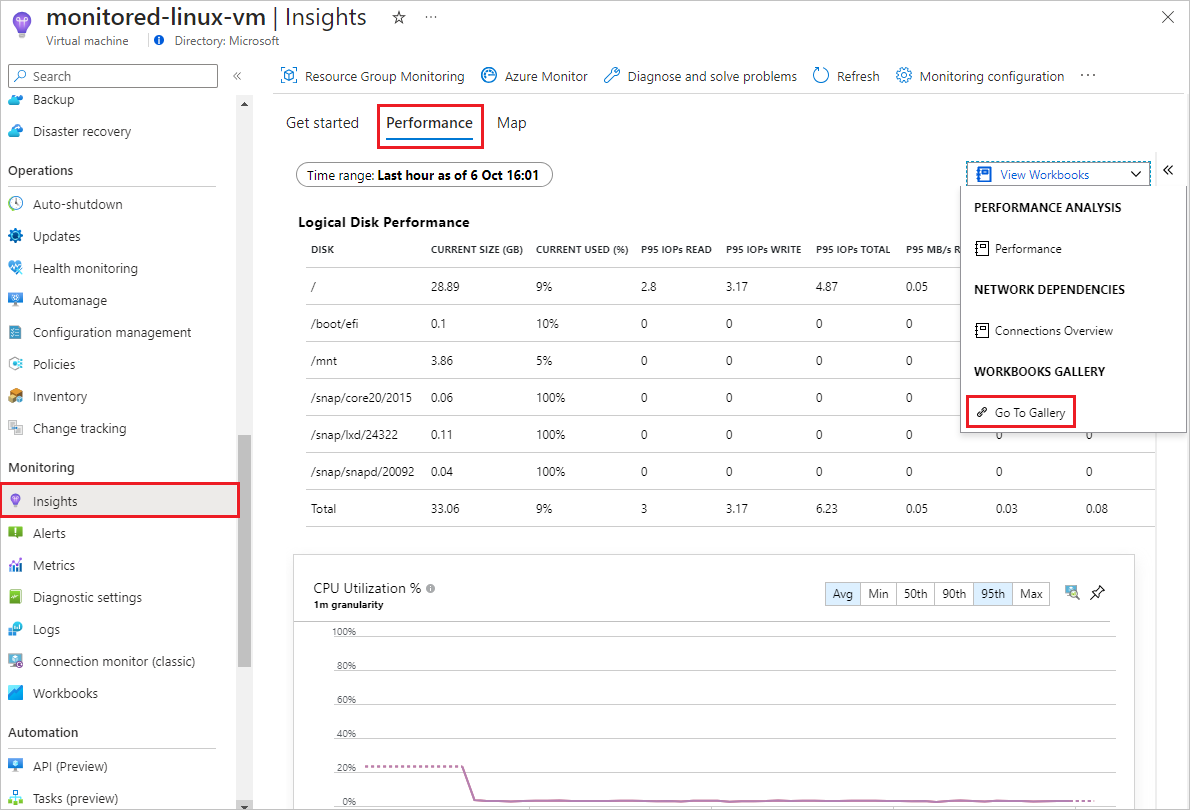 Select View Workbooks to select from other available prebuilt VM insights workbooks. Select Go To Gallery to select from a gallery of other VM insights workbooks and workbook templates, or to edit and create your own workbooks.