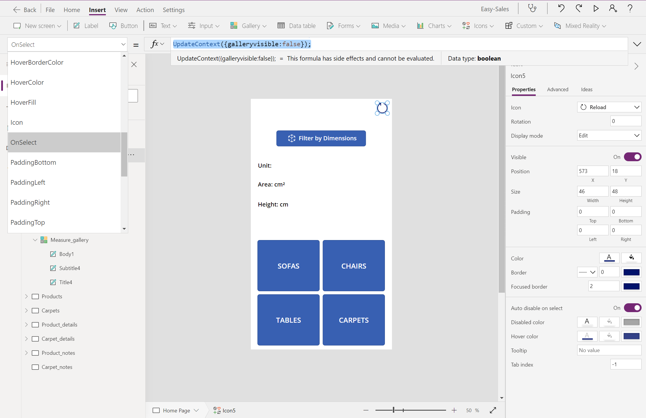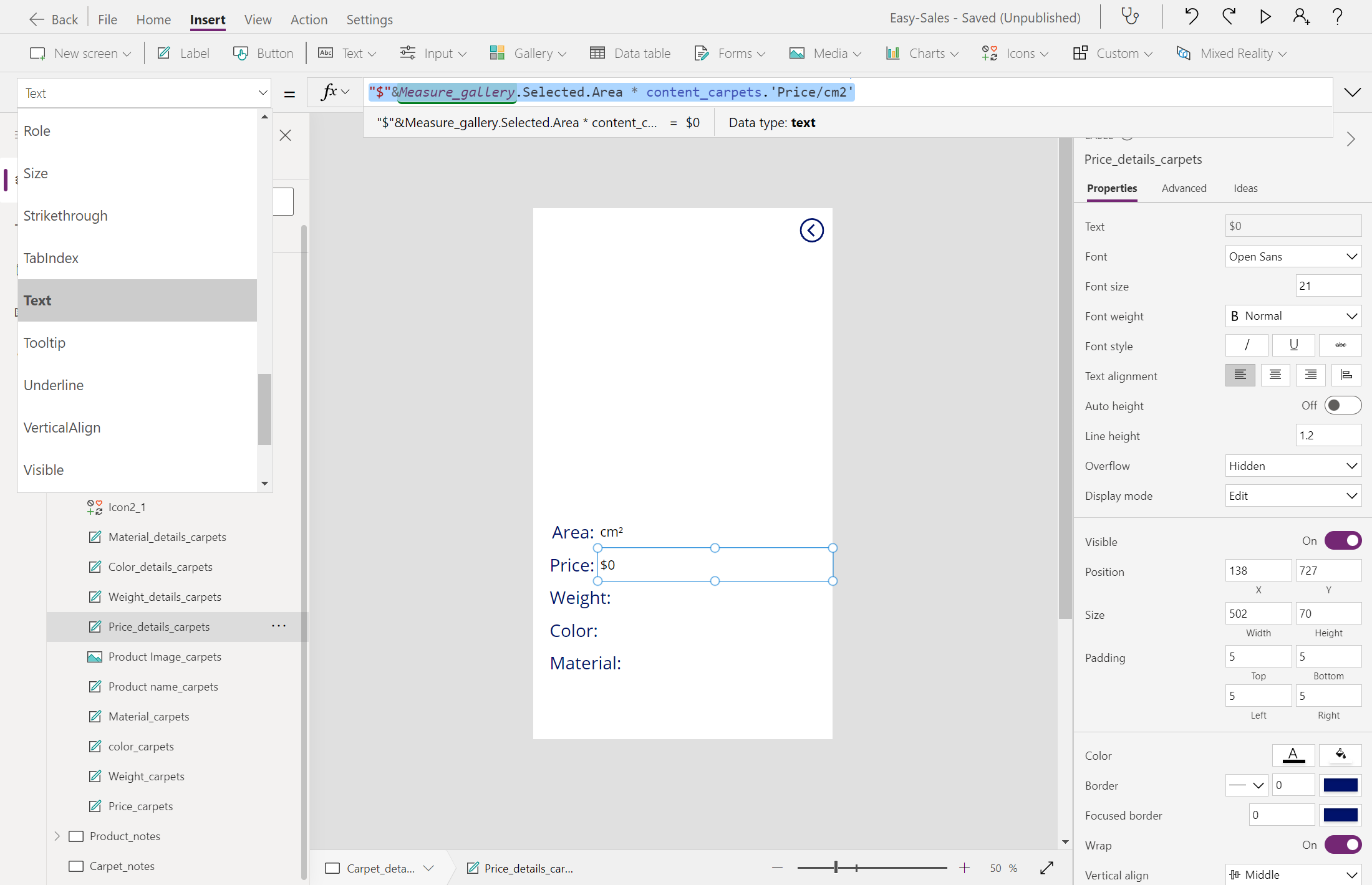 Go to the Carpet_details page, then add a Label, and then rename it Area_carpets.