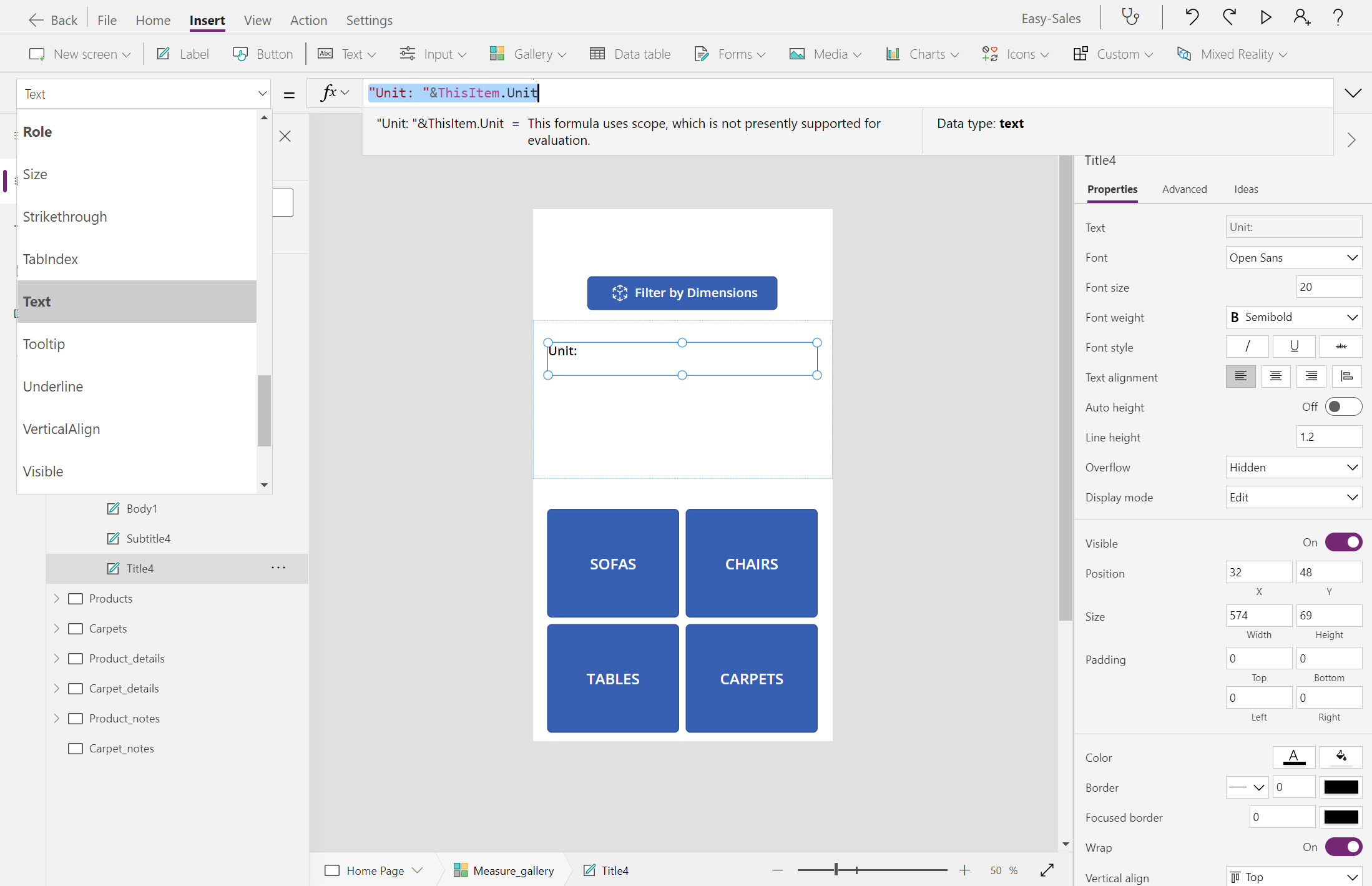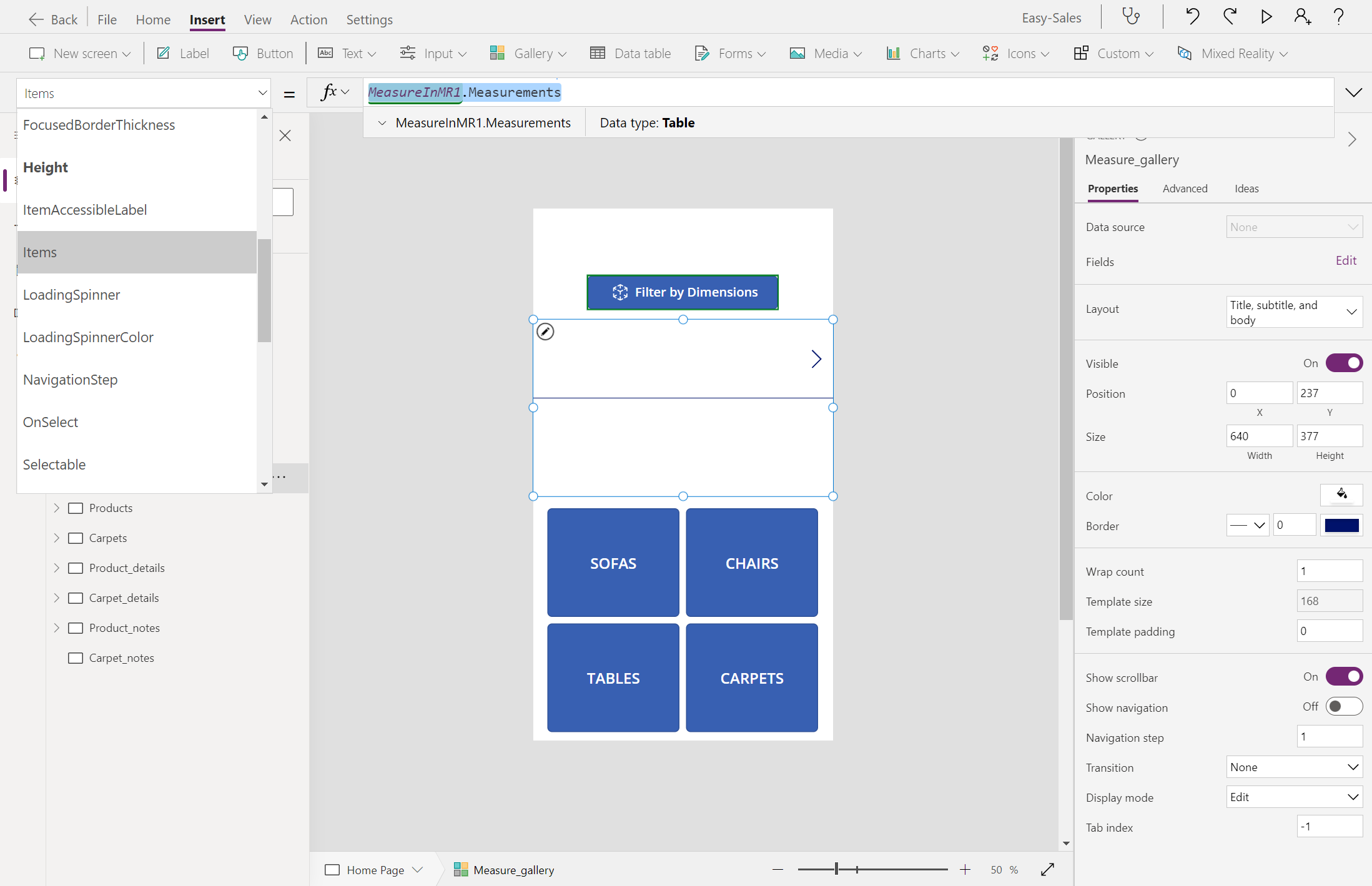 On the Home page, add a Gallery by selecting the Gallery > Vertical. Change the name of Gallery to Measure_gallery.