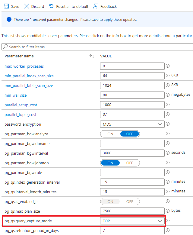 Select Server parameters and navigate to the pg_qs.query_capture_mode setting.