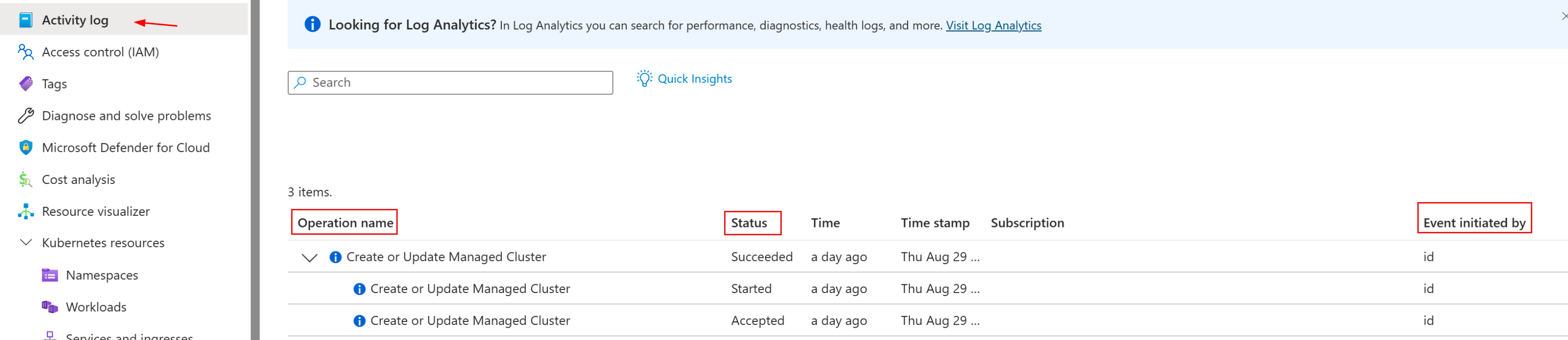 On the Activity Log page, locate log entries in which the Operation name column shows Create or Update Managed Cluster.