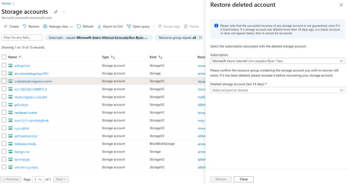 Select the subscription for the account you want to recover from the Subscription drop-down list.