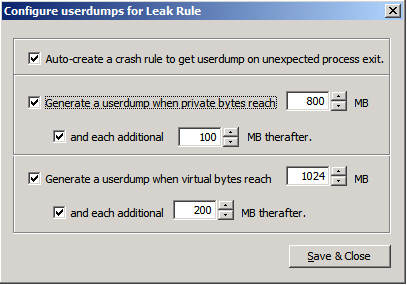 You can adjust these values if needed, but be careful not to specify a small number of MB in order to generate the tons of dump files. Generate a userdump when private bytes reach 800 MB and each additional 100 MB thereafter. Generate a userdump when virtual bytes reach 1,024 MB and each additional 200 MB thereafter.