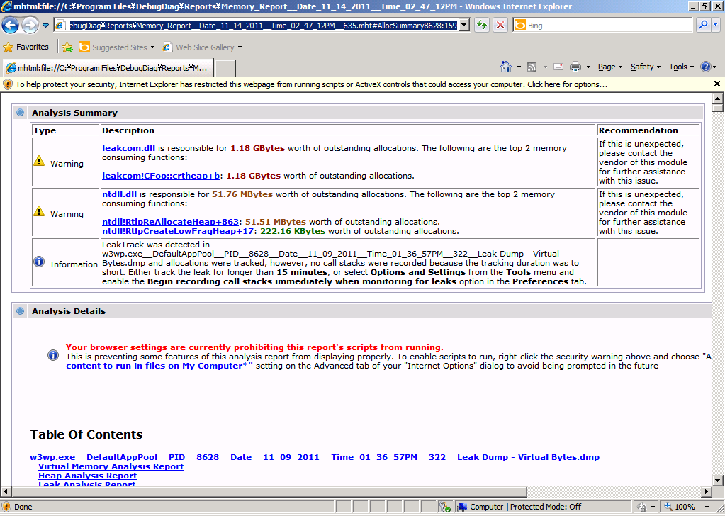 DebugDiag takes a few minutes to parse through the dumps and provide an analysis. When it has completed the analysis, you see a page similar to the following image: