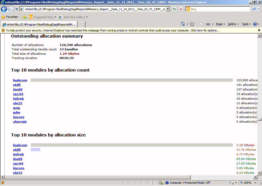 The top of the report tells you that the memory leak was detected. In the Table Of Contents, you'll see a link to the details of Leak Analysis Report. Select that link and you'll see information about what those top 10 modules by allocation count or allocation size. Here is the example: