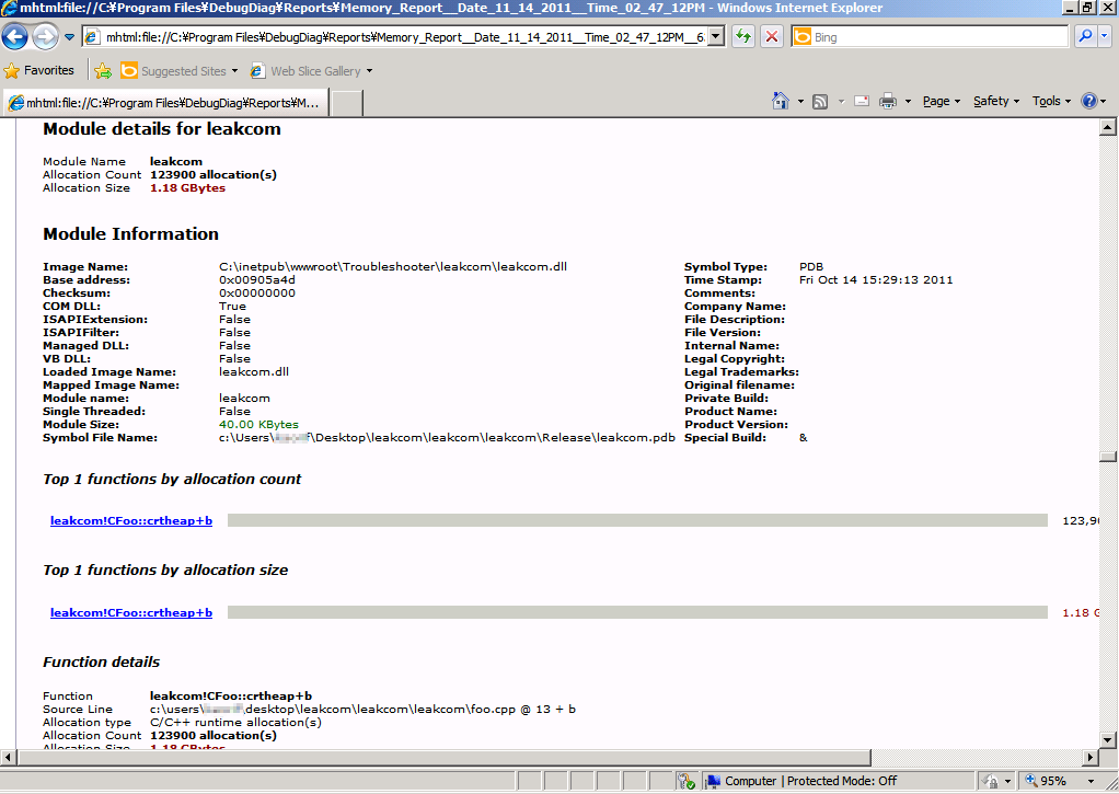 From this analysis, you can see the leakcom component is running. To look further down the Module Information of leakcom as shown below, you can see that CFoo::crtheap method allocates the outstanding memory.