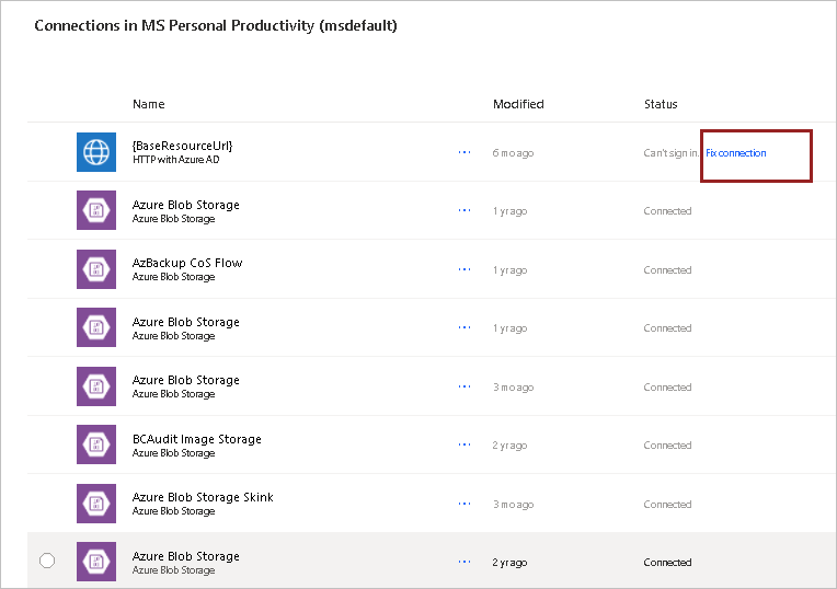 To fix a broken connection, select the link next to the Status column, and then follow the instructions.