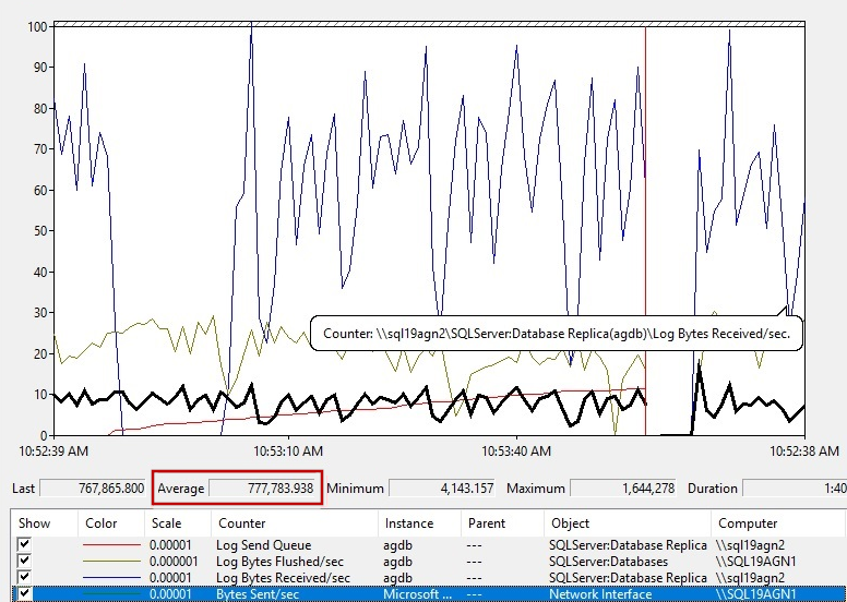 Verify what NTttcp reports. A large transaction is run in SQL Server on the primary replica. After you start Performance Monitor on the primary replica, add the Network Interface::Bytes Sent/sec counter. This counter confirms that the primary replica can send about 777 KB/sec of data. This is similar to the value of 739 KB/sec that's reported by the NTttcp test.