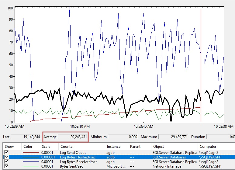 It's also useful to compare the SQL Server::Databases::Log Bytes Flushed/sec value on the primary replica to SQL Server::Database Replica::Log Bytes Received/sec for the same database on the secondary replica. On an average, we observe ~20 MB/sec of changes that's created in the "agdb" database. However, the secondary replica is receiving, on average, only 5.4 MB of changes. This will cause log send queueing on the primary replica of outstanding changes in the database transaction log that haven't yet been sent to the secondary replica.