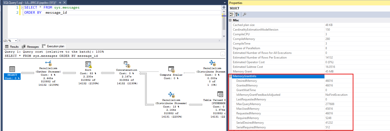 This query selects a rowset of over 300,000 rows and sorts it. The sort operation induces a memory grant request. If you run this query in SSMS, you can view its query plan. When you select the left-most SELECT operator of the query plan, you can view the memory grant information for the query (press F4 to show Properties):